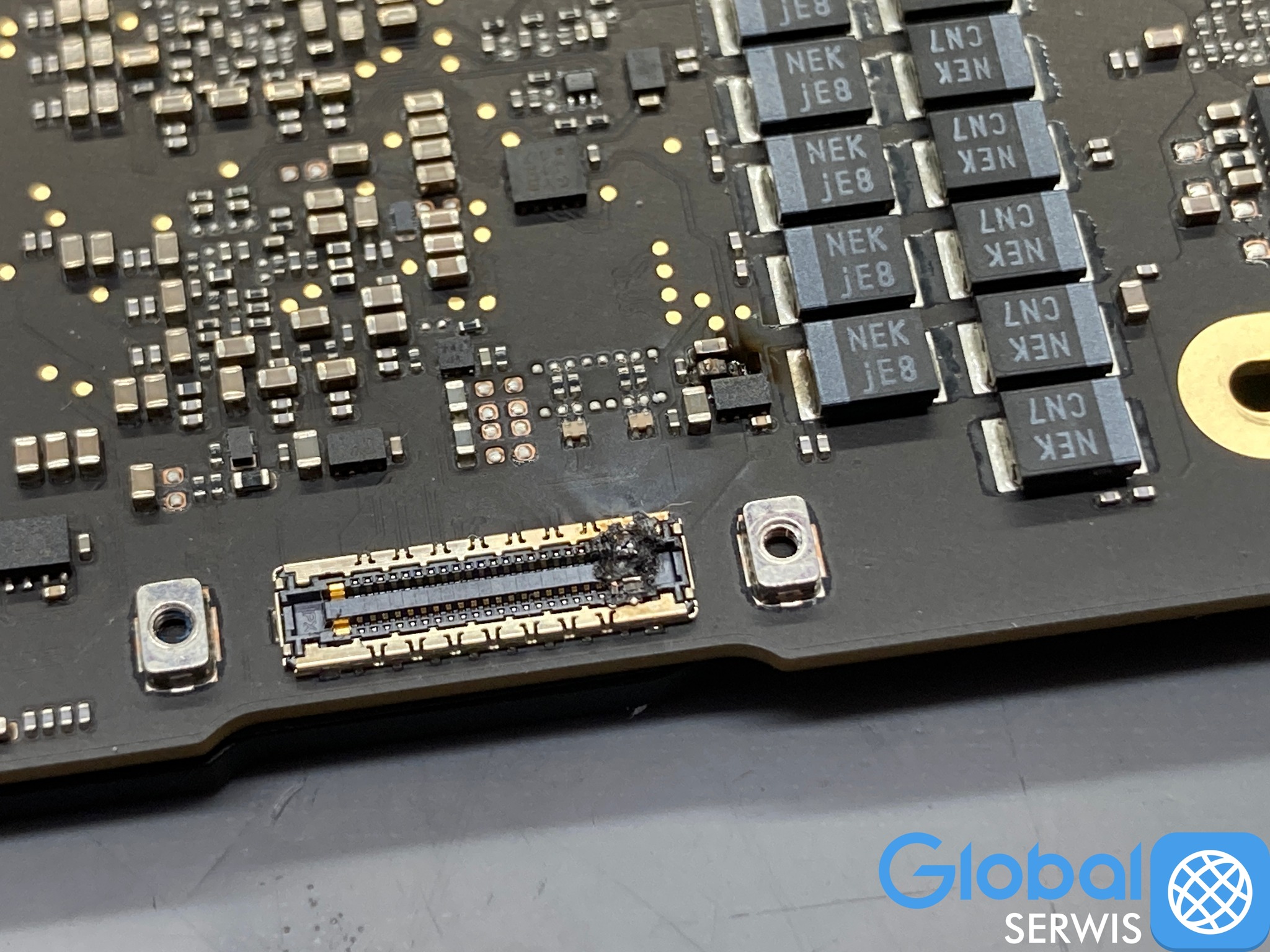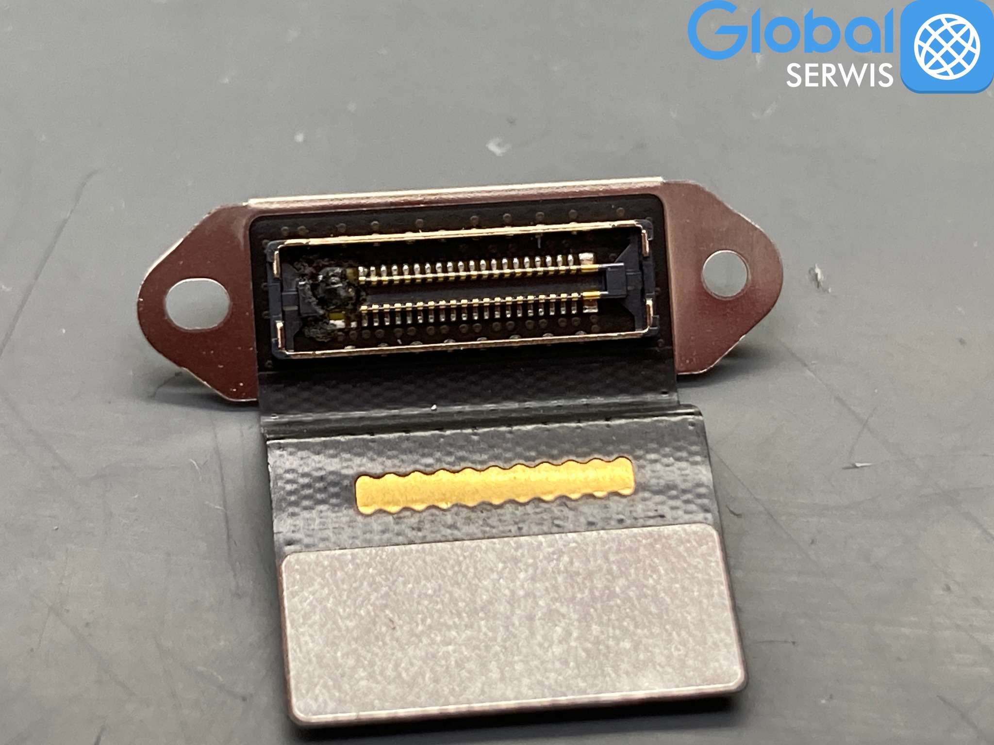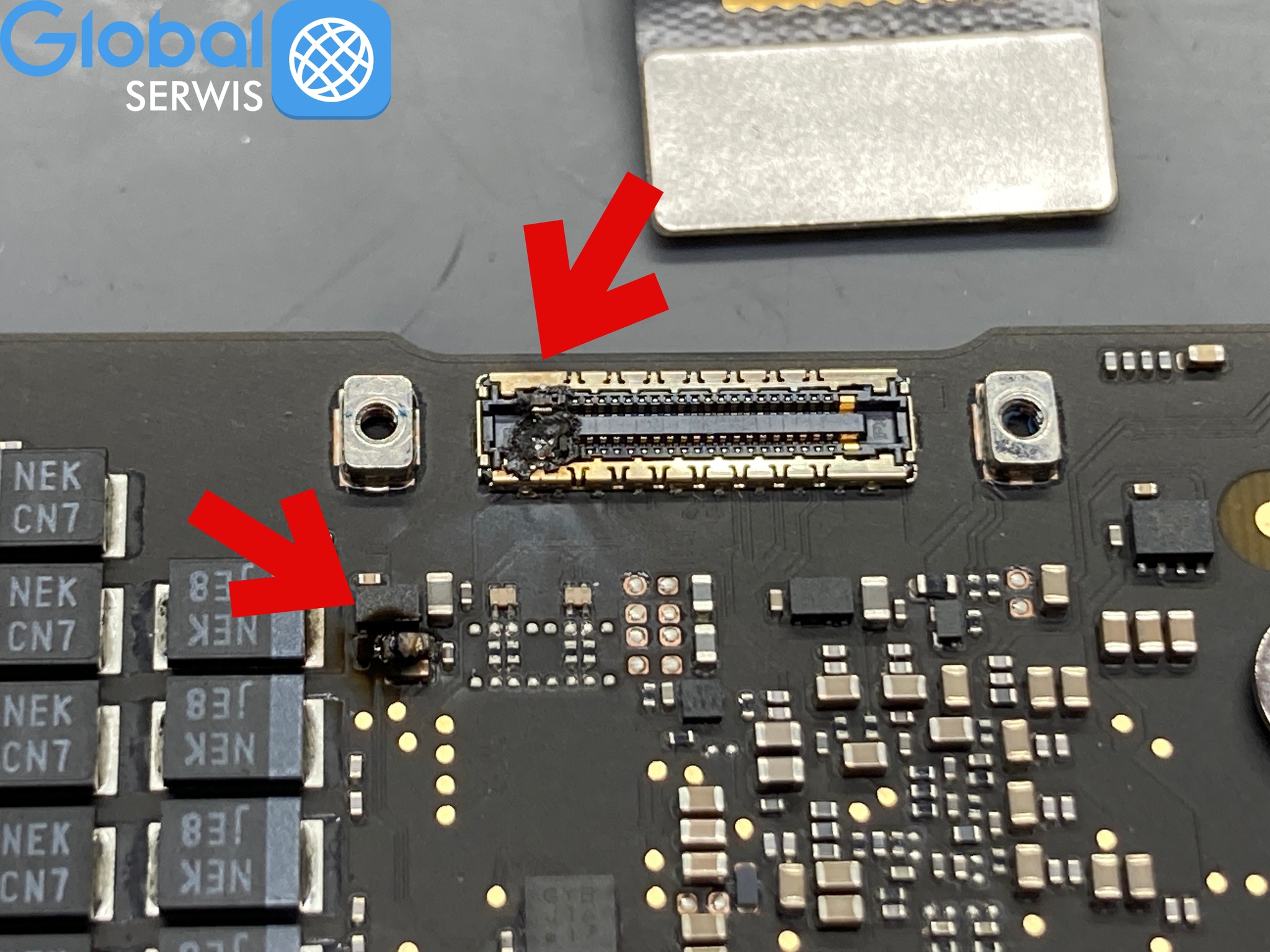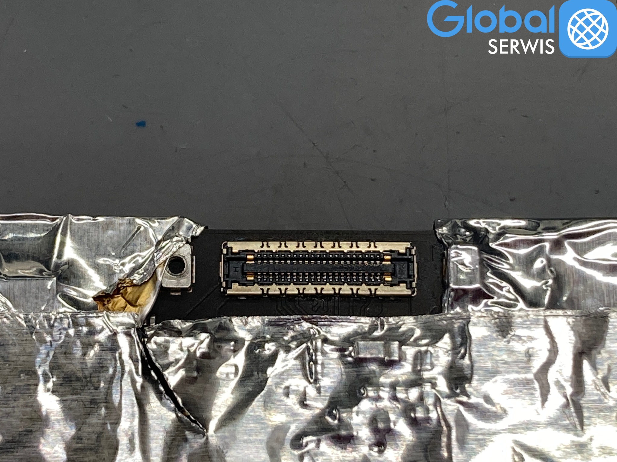 Diagnoza : Uszkodzenia na płycie głównej (spalone złącze LVDS, spalona taśma sygnałowa, uszkodzenia elementów zasilania matrycy oraz kamerki).