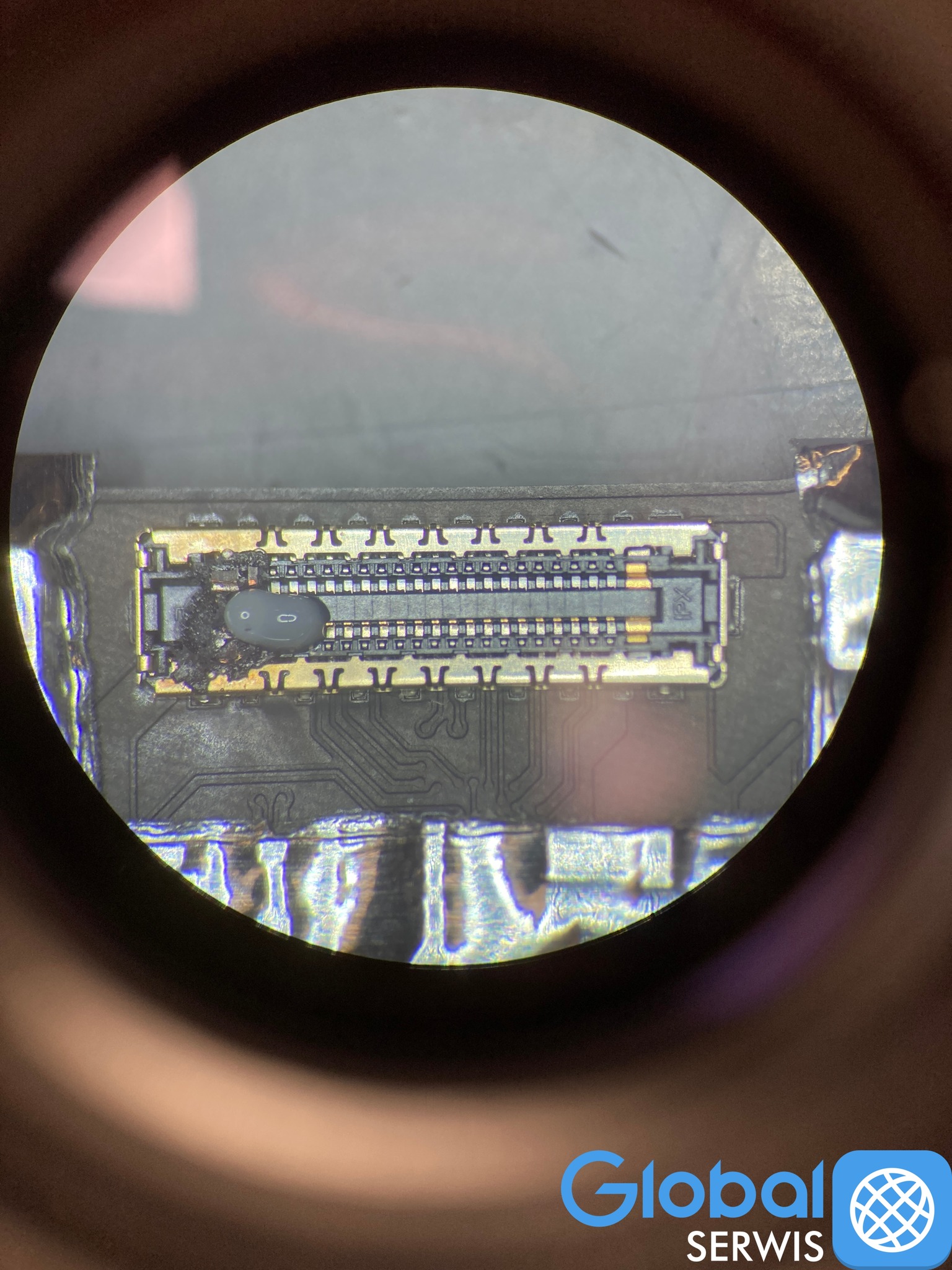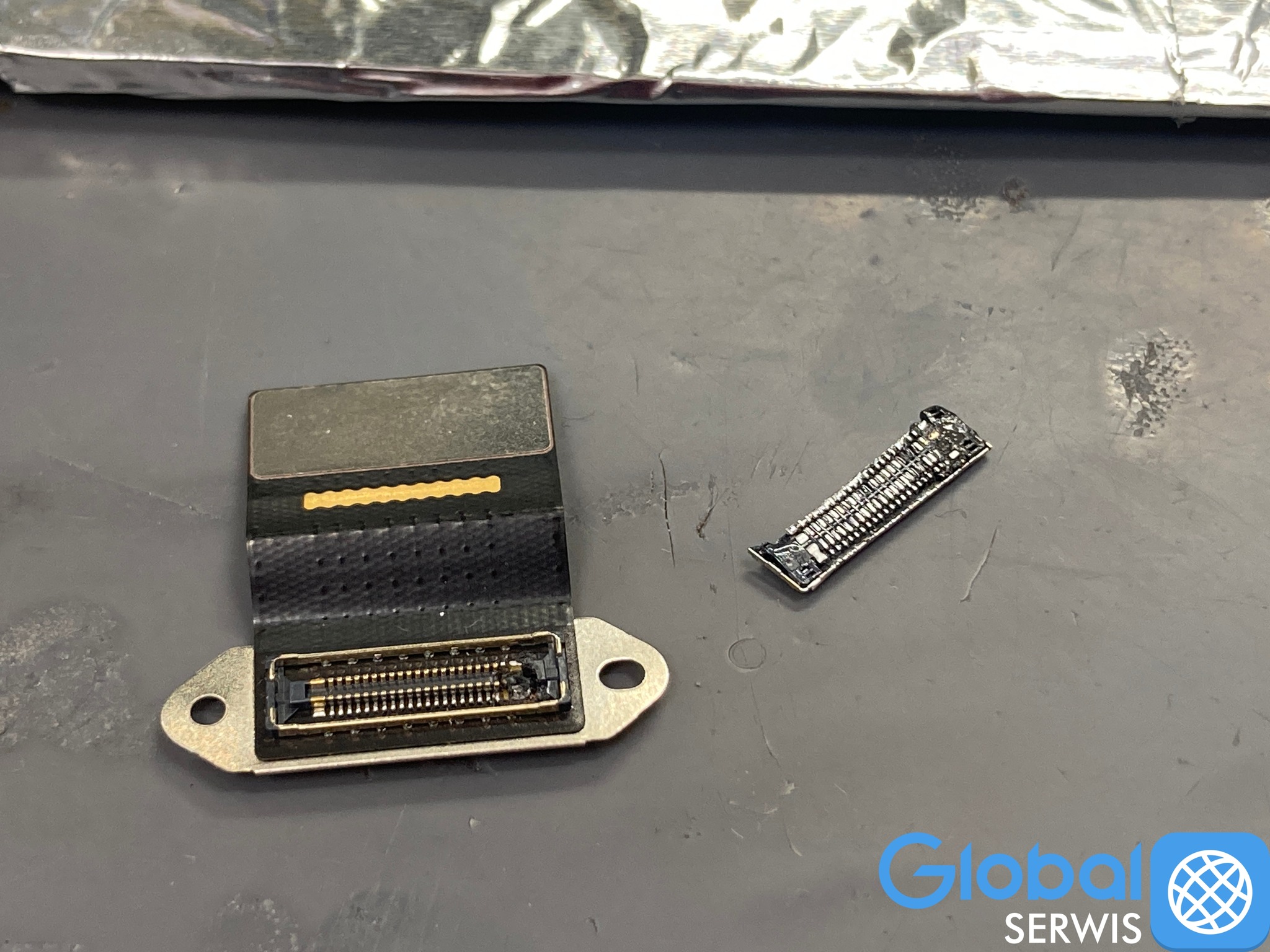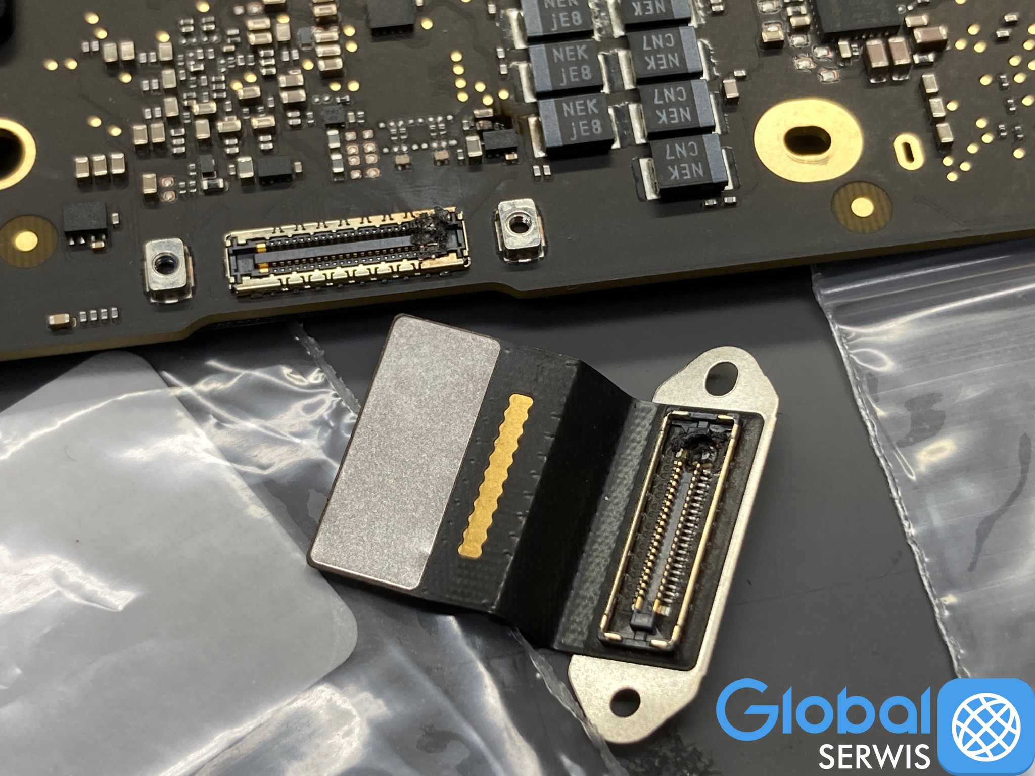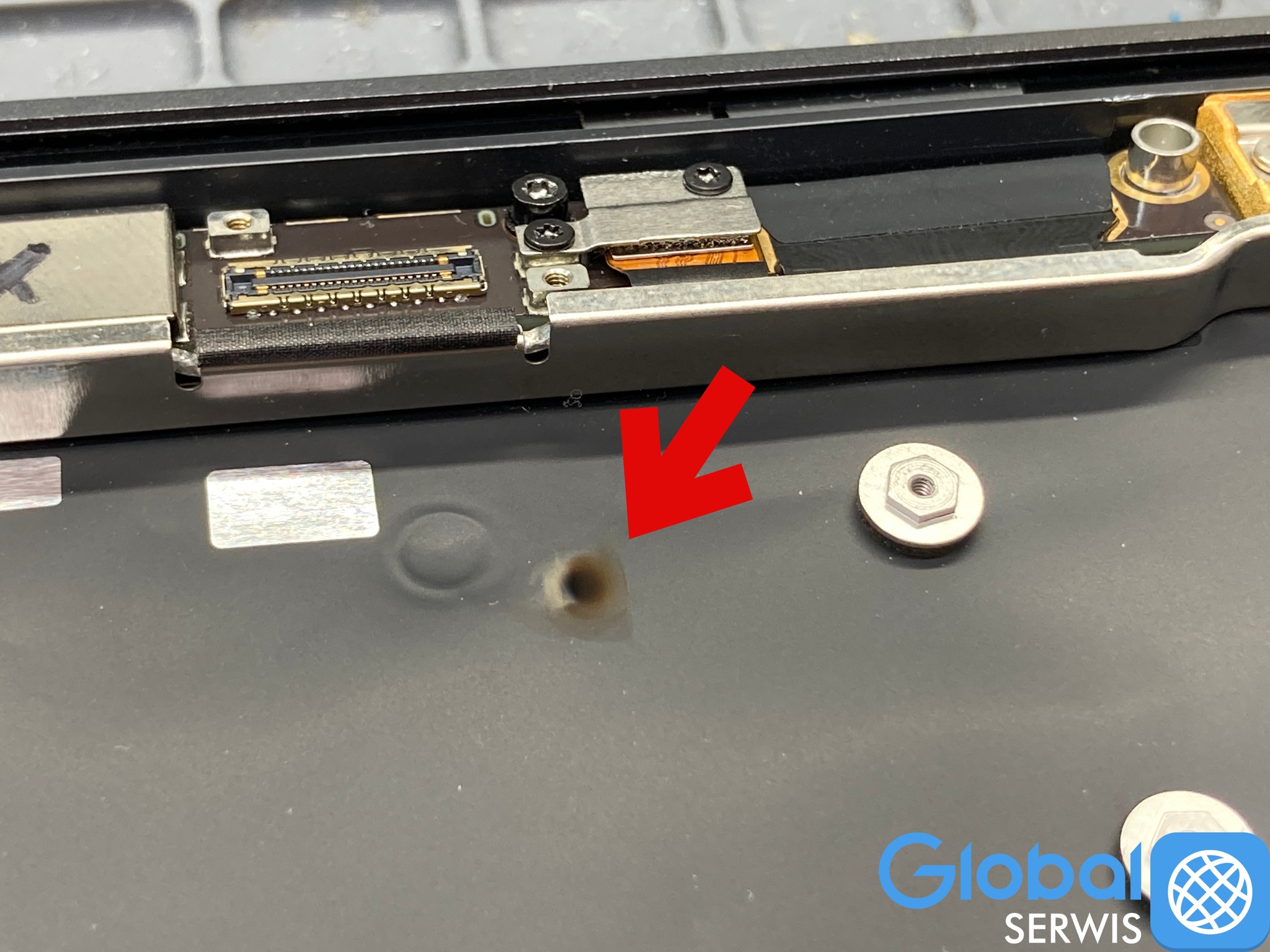 Diagnoza : Uszkodzenia na płycie głównej (spalone złącze LVDS, spalona taśma sygnałowa, uszkodzenia elementów zasilania matrycy oraz kamerki).
