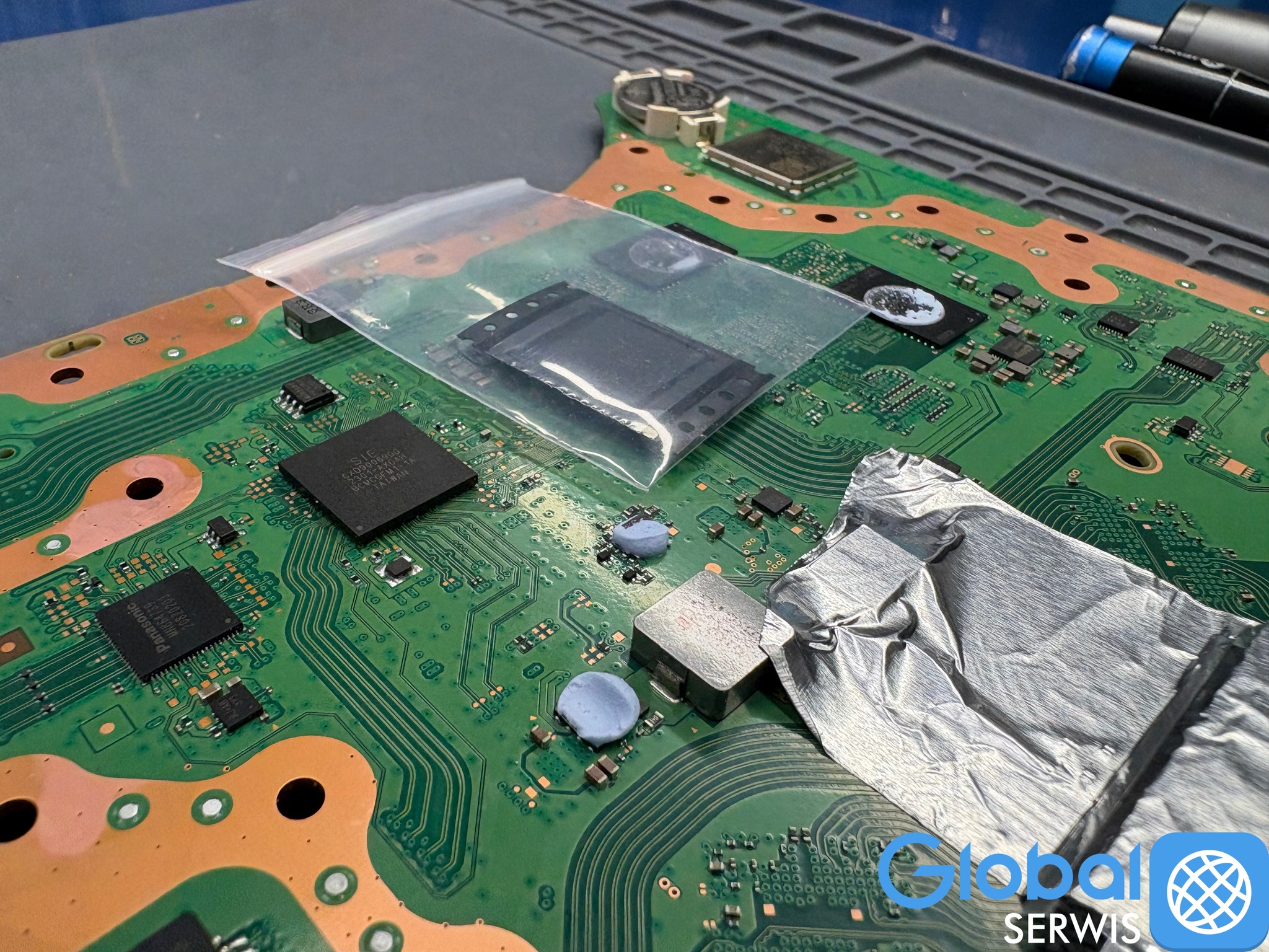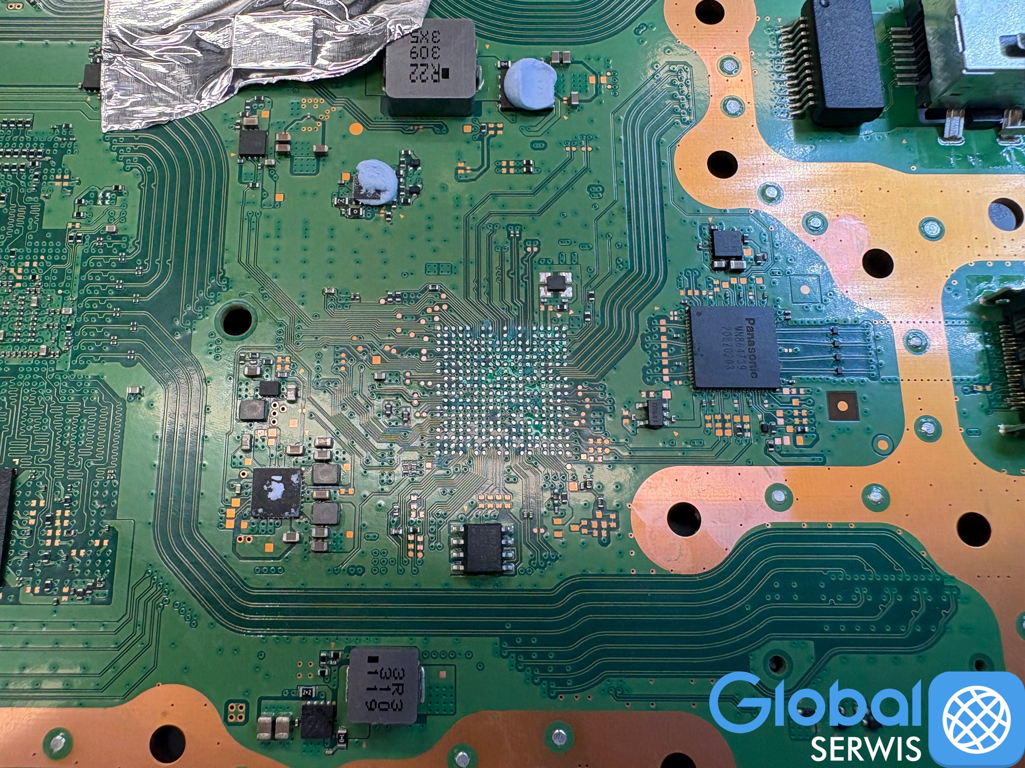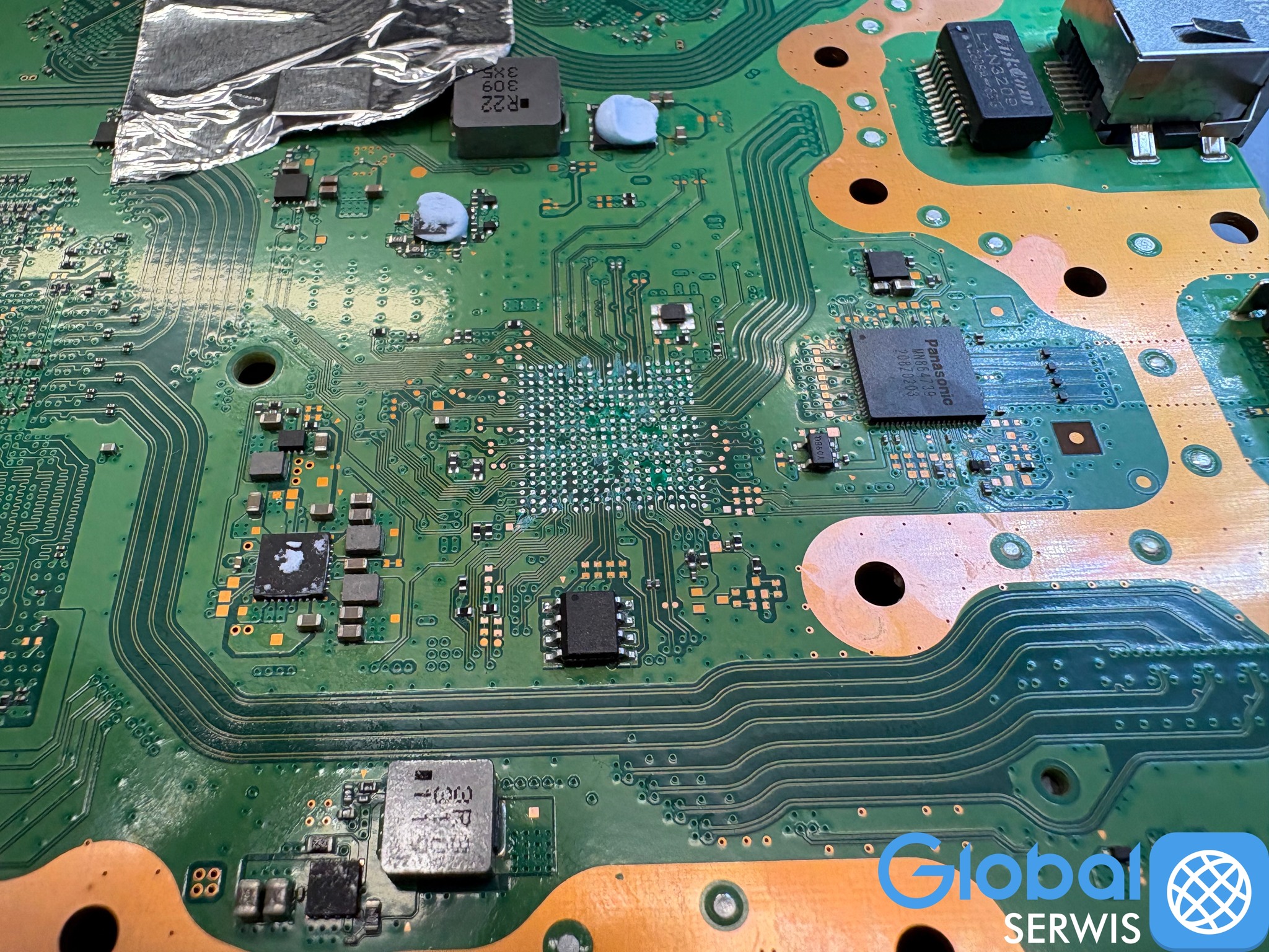 Kolejny błąd to wlutowanie nowego układu bez naprawy soldermaski co spowodowało zwarcia (zlepienie) połączeń cynowych BGA.