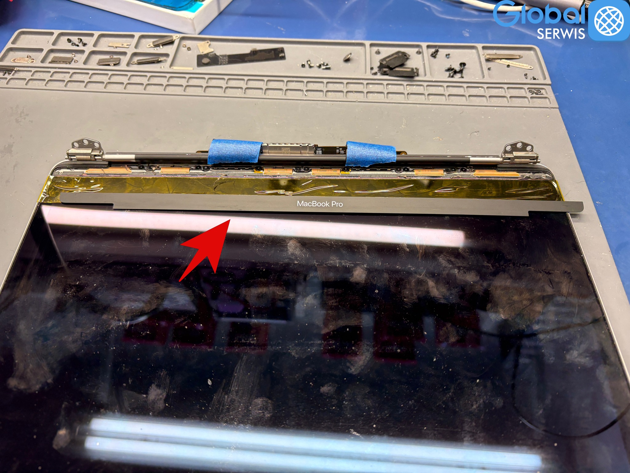 - rozklejenie dolnej (szklanej i bardzo delikatnej) ramki ekranu na której widnieje napis MacBook Pro.