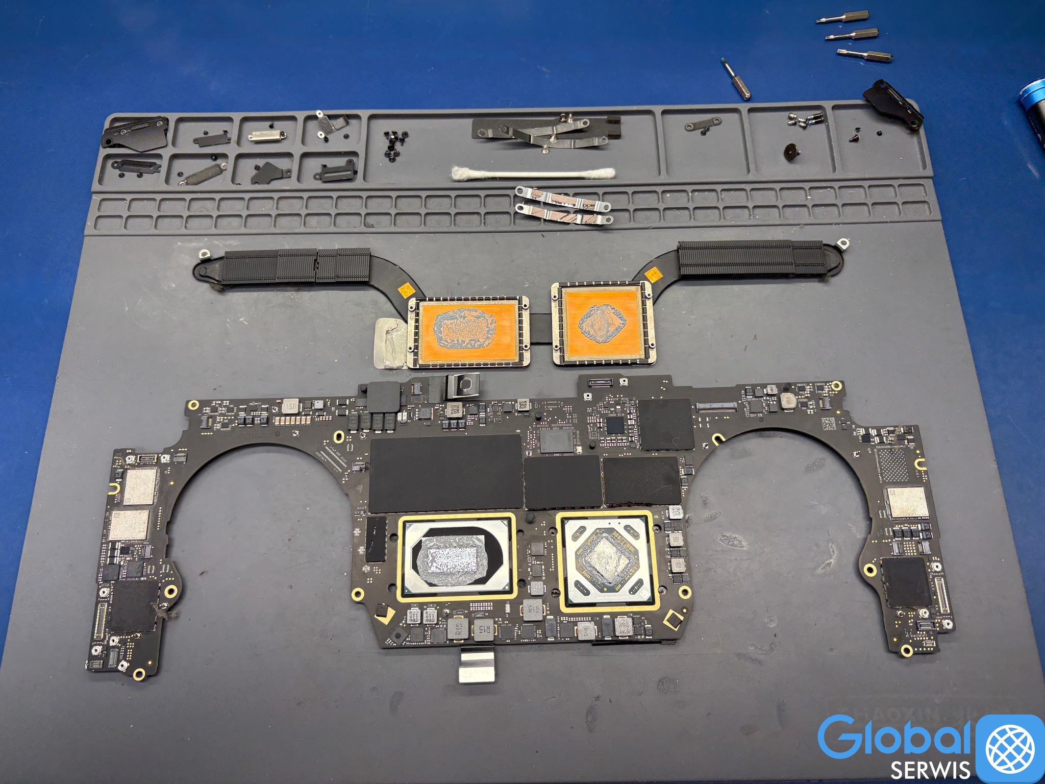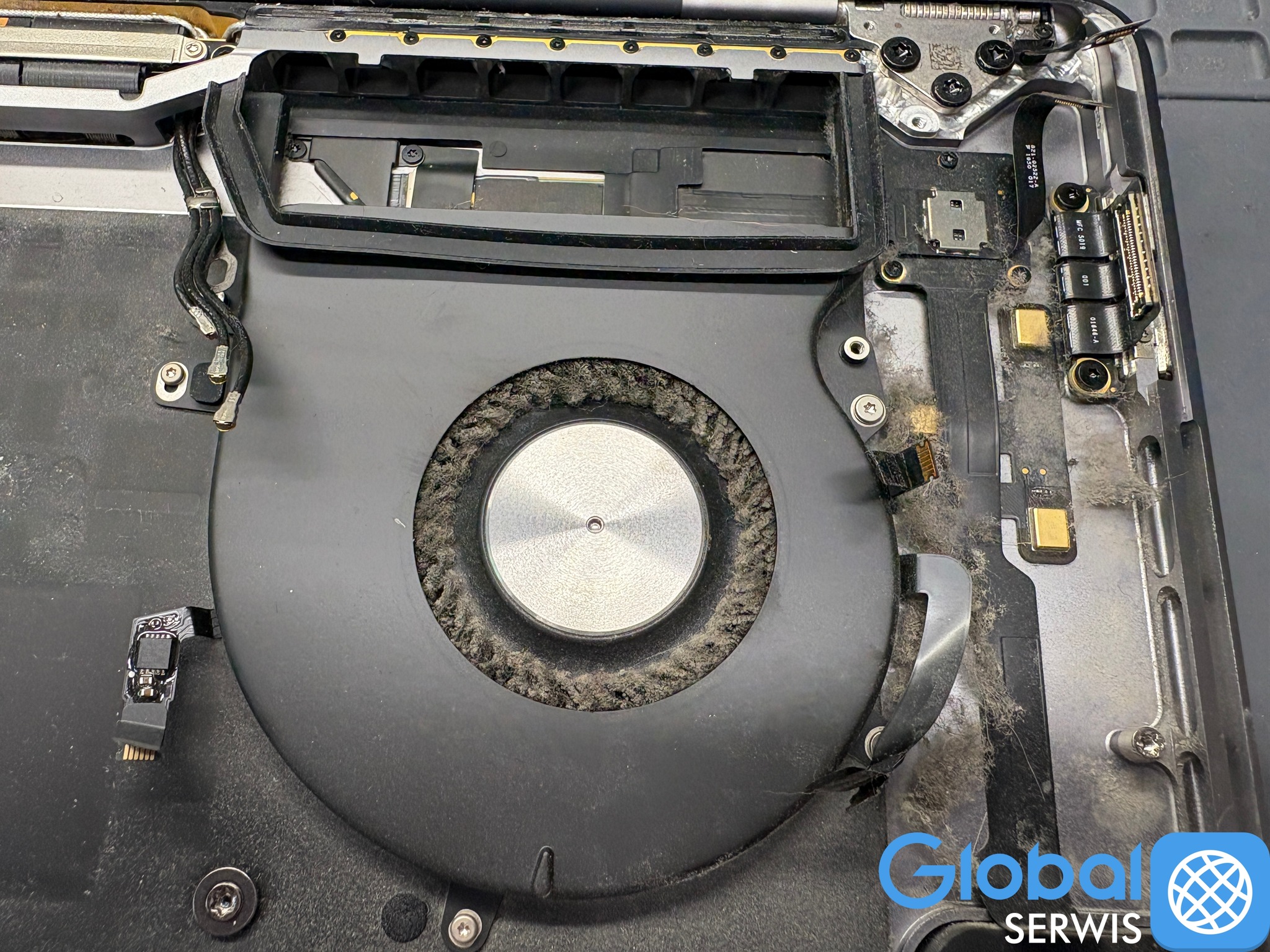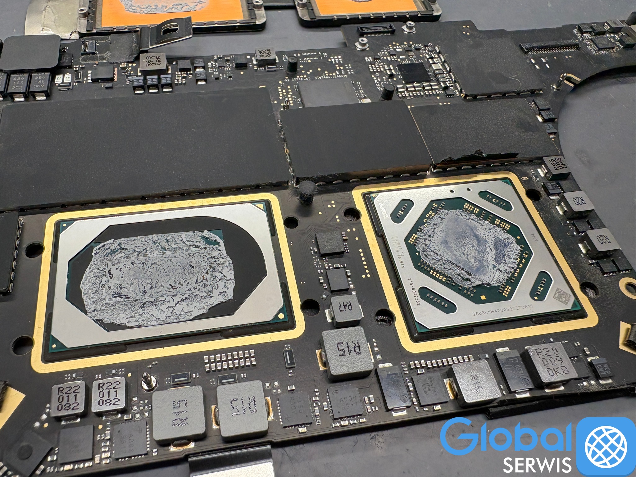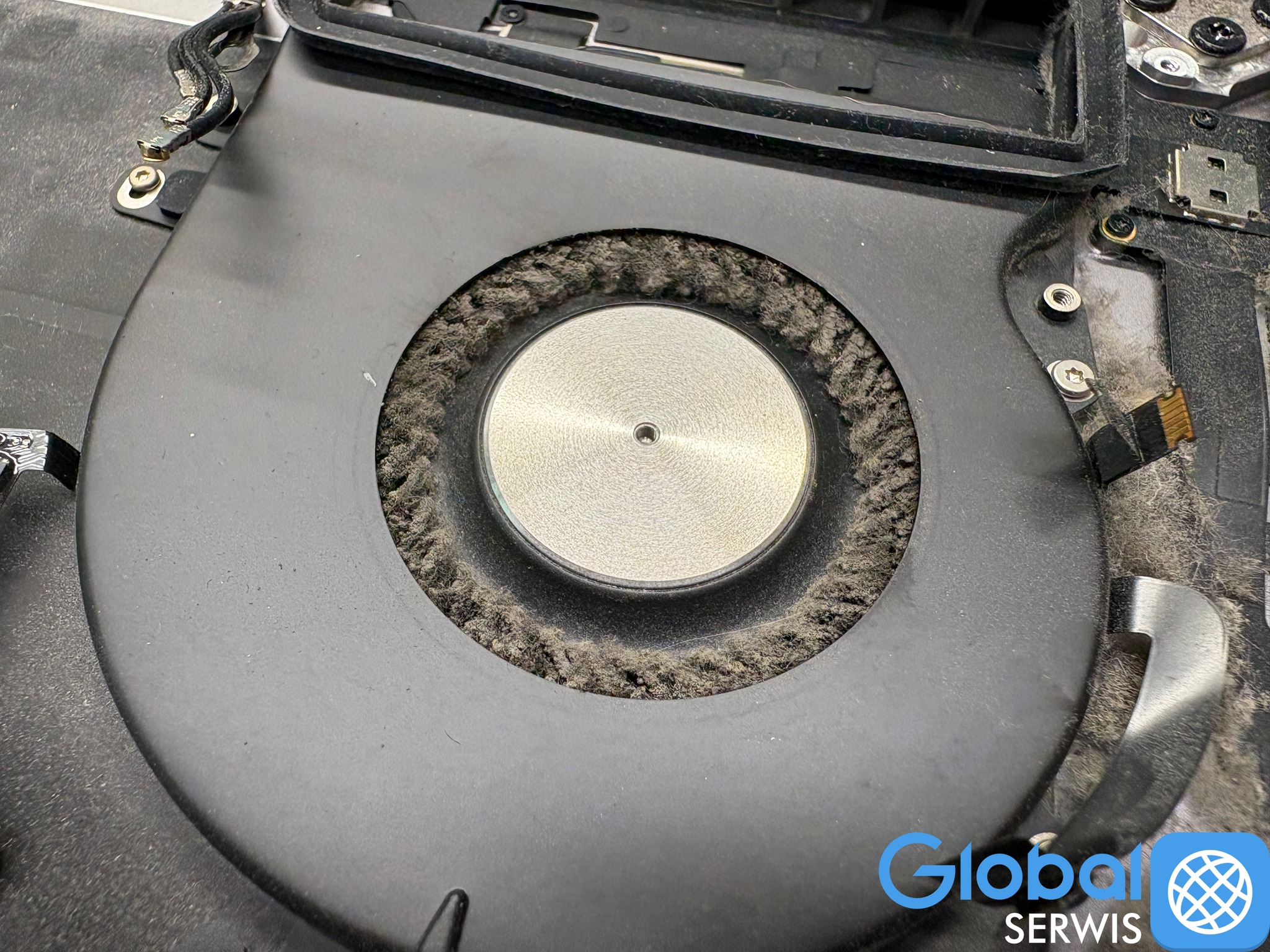 Jak widać na zdjęciach laptop jest mocno zanieczyszczony, pasty termo przewodzące na rdzeniach GPU oraz CPU mocno zaschnięte.